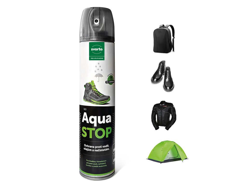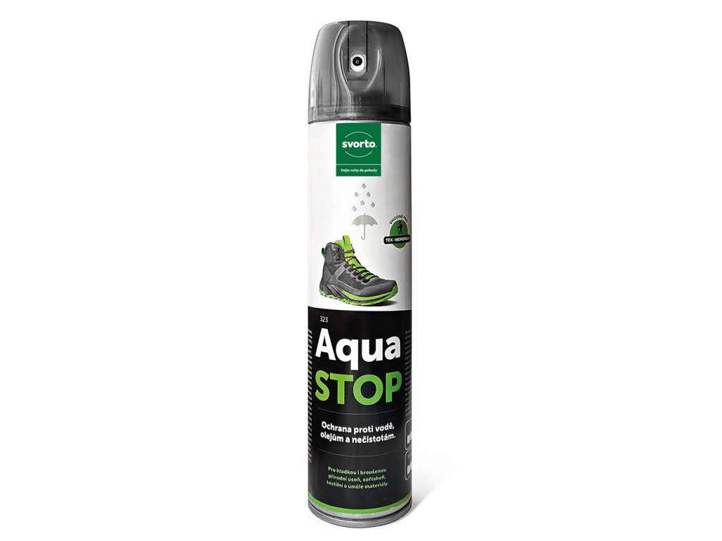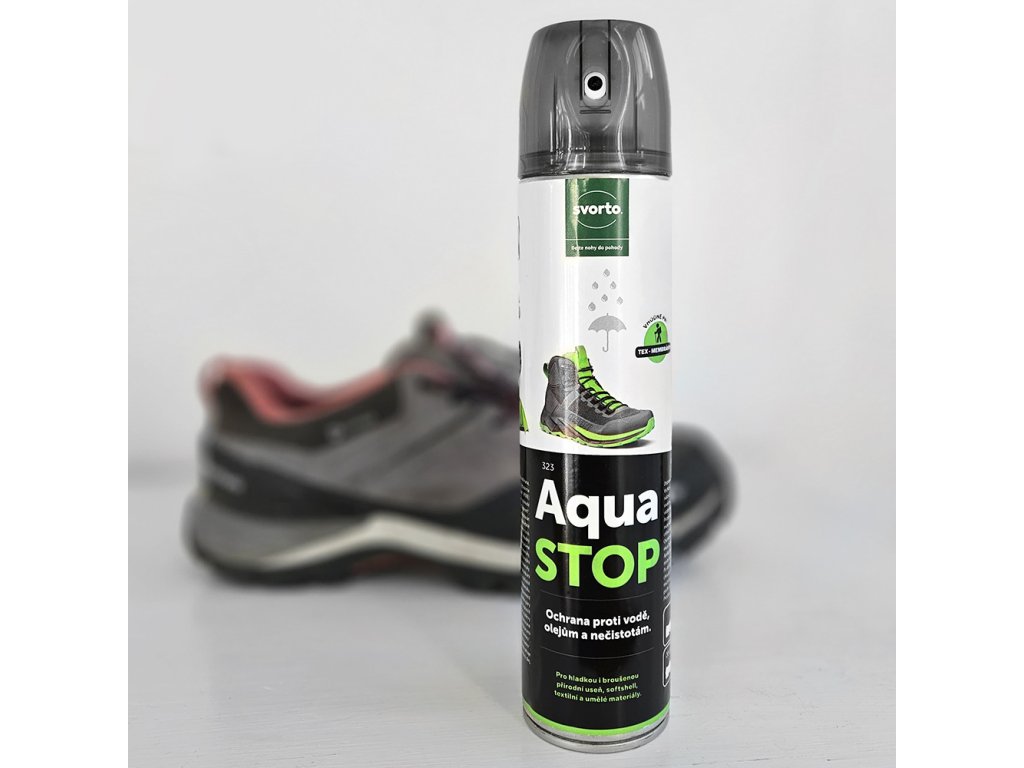 Novodobá ochrana obuvi, oblečení, deštníků, tašek, dětských aktovek, batohů a různých dalších doplňků před vlhkostí, prachem a olejovými látkami. Doporučujeme pro široké použití od hladkých kožených materiálů přes broušené usně až po high-tech materiály.Impregnace je vhodná pro textilní materiály speciálně upravené proti průniku vody a označené visačkou Teflon(R). Aqua stop 300 ml nesnižuje propustnost pro vodní páry a neobsahuje silikonový olej. Je testován pro použití na obuv, oblečení a vybavení kombinované s tex-membránami typu Gore-tex, Sympatex apod.Návod k použití: Aquastop důkladně protřepejte a stejnoměrně nastříkejte na čistý a suchý povrch ze vzdálenosti cca 20 cm. Nechejte volně zaschnout. Vyzkoušejte barevnou a materiálovou snášenlivost na méně viditelném místě. Především u plastových materiálů upozorňujeme na citlivost na rozpouštědla.Vyrobeno v České republice.