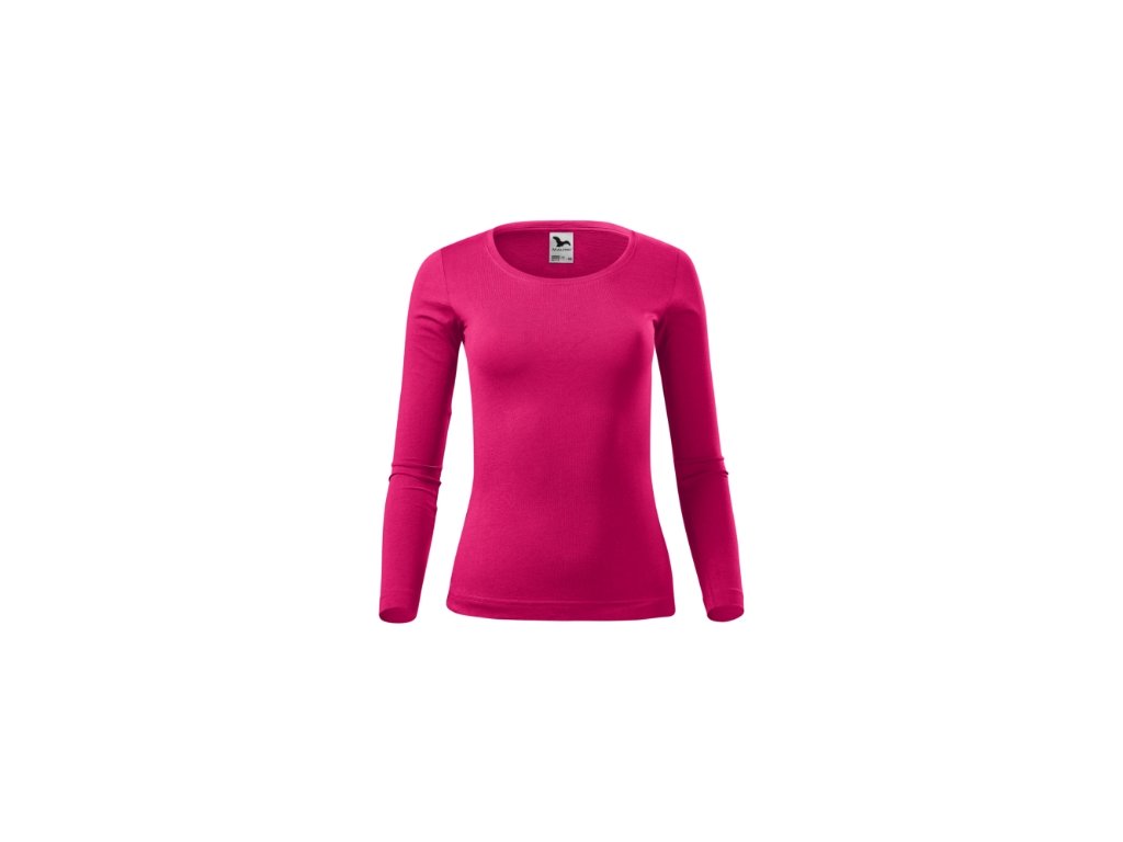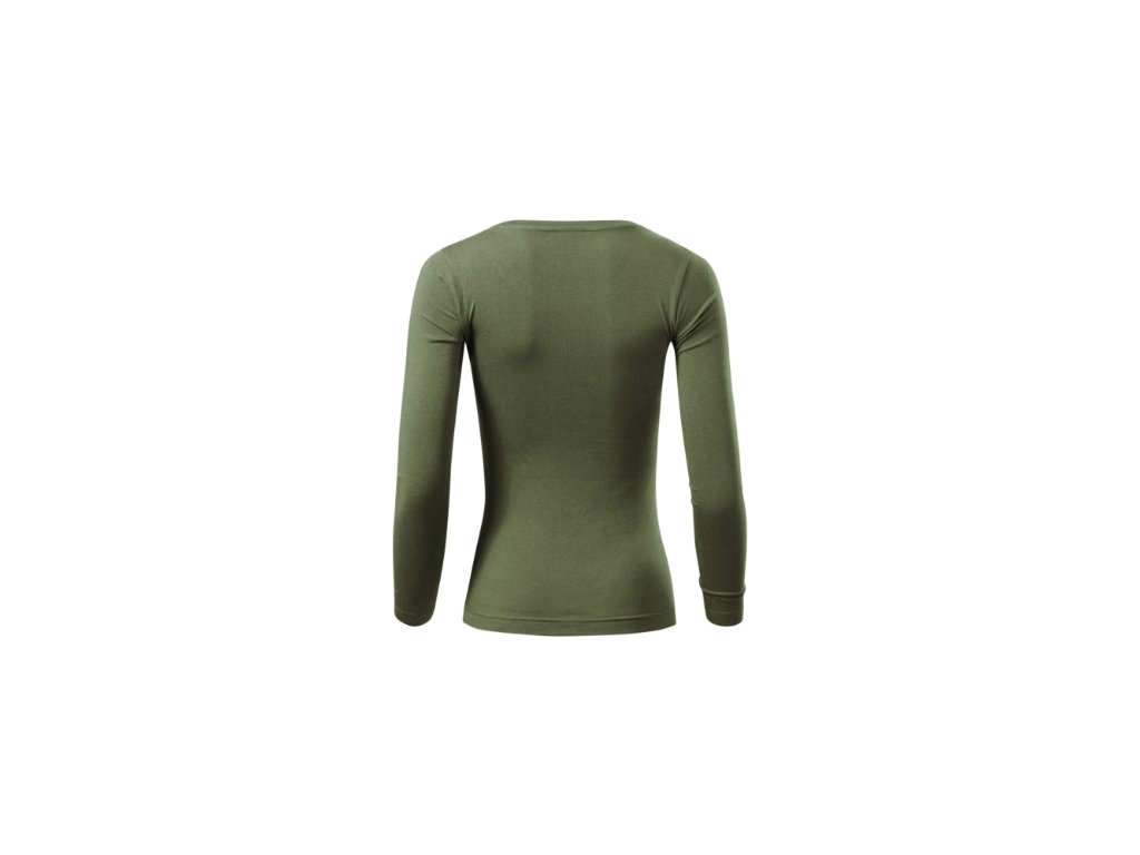 Dámské tričko - lehce vypasovaný střih s bočními švy, hlubší kulatý výstřih, úzký lem průkrčníku z žebrového úpletu 1:1 s 5 % elastanu, vnitřní část průkrčníku začištěna páskou z vrchového materiálu, zpevnění ramenních švů páskou, dlouhé rukávy