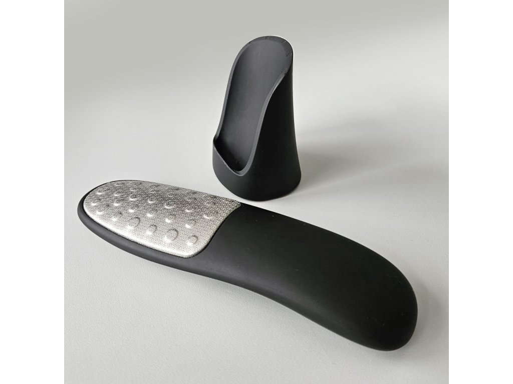 ● hrubší strana pro efektivní odstranění zrohovatělé kůže● jemnější strana pro citlivější místa a závěrečné vyhlazení● vyrobeno pomocí laserové technologie● ušlechtilá nerezová ocel● ergonomický tvar● praktický stojánek● 16,5 cm