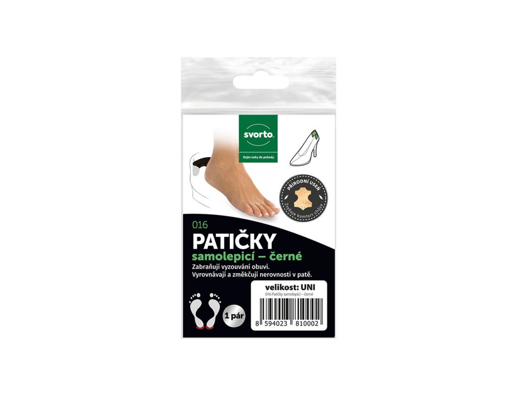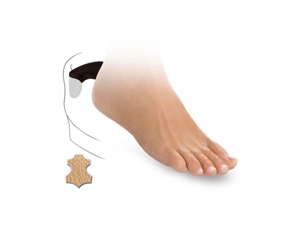 ● přírodní useň vyměkčená lehkou latexovou pěnou ● černé ● samolepicí fólie Přírodní hovězinová useň v černé barvě se zdrsněným povrchem, výplň ze šlehaného latexu a samolepicí fólie tvoří jednoduchou pomůcku se snadnou aplikací. Nejčastější využití je k zabránění vyzouvání obuvi, prevence vzniku otlaků v patě, vyrovnání nerovností v patní části obuvi. Tvar patičky koresponduje s tvarem patní části obuvi. Nákres v přibalovaném letáku znázorňuje ideální umístění patičky.Materiál: přírodní useň, latexová pěna, samolepicí fólie