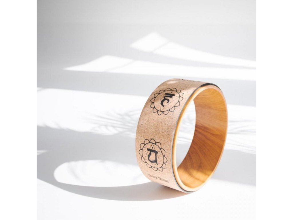Koło do jogi, 100% korek, wymiary 32 × 32 × 13 cm, waga 1300 g, maks. obciążenie 150 kg.  Koło do jogi jest pomocne w głębszym rozciąganiu kręgosłupa, klatki piersiowej, ramion i bioder, pomaga otworzyć klatkę piersiową, rozciągnąć ramiona, plecy i biodra w bardzo bezpośredni sposób. Okrąg ma idealny rozmiar do bezpiecznego rozciągania kręgosłupa.