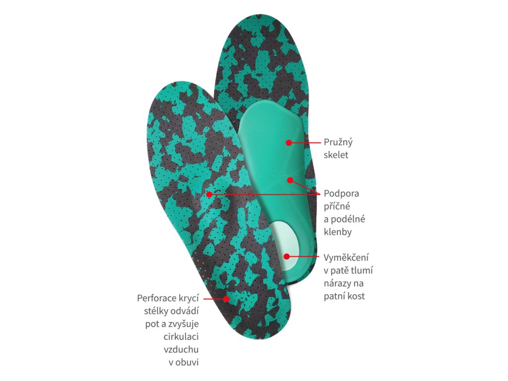 ● ortopedicky tvarované● podpora podélné a příčné klenby● pružný plastový skelet pro přirozený pohyb chodidla● vyměkčení v patě tlumí nárazy na patní kost● snadná údržba● perforace krycí stélky odvádí pot a zvyšuje cirkulaci vzduchu v obuvi