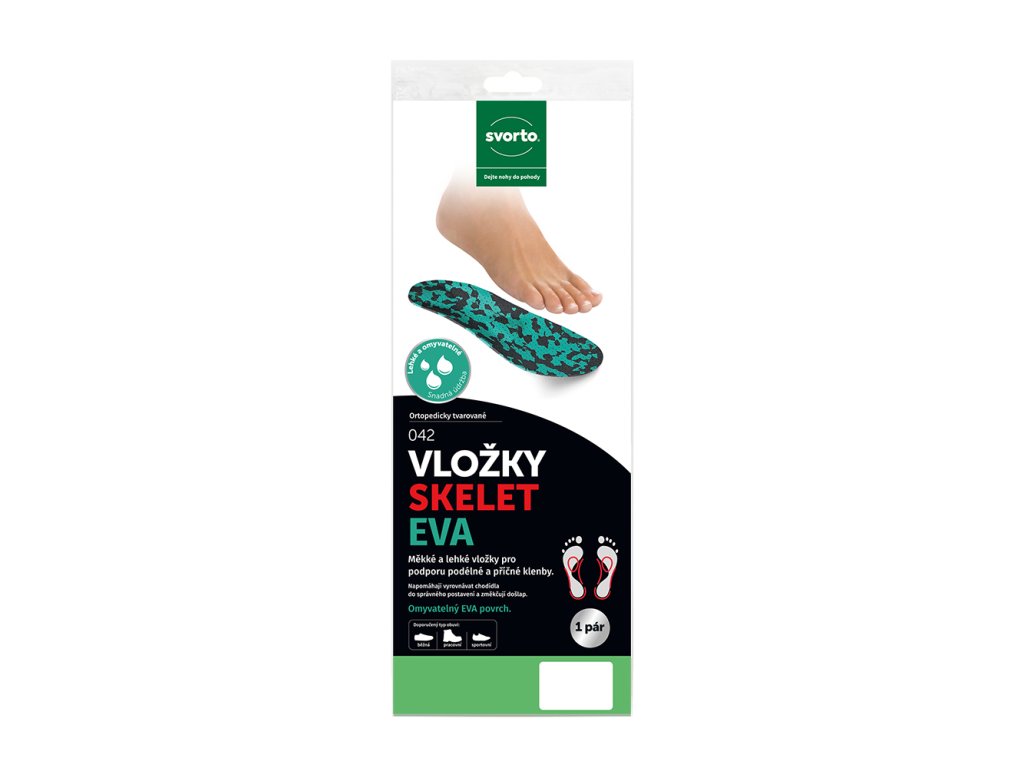 Základem vložek skelet EVA je tenký, pružný a tvarově stálý výlisek (skelet), který minimálně zmenšuje vnitřní prostor obuvi a podepírá podélnou klenbu. Příčnou klenbu podepírá měkké latexové srdíčko, vyměkčení v patní části vložky tlumí nárazy na patní kost. Krycí stélka je vyrobena z materiálu EVA, který je oblíbený pro svou měkkost a omyvatelnost. Perforace krycí stélky odvádí případný pot a zvyšuje cirkulaci vzduchu v obuvi.
