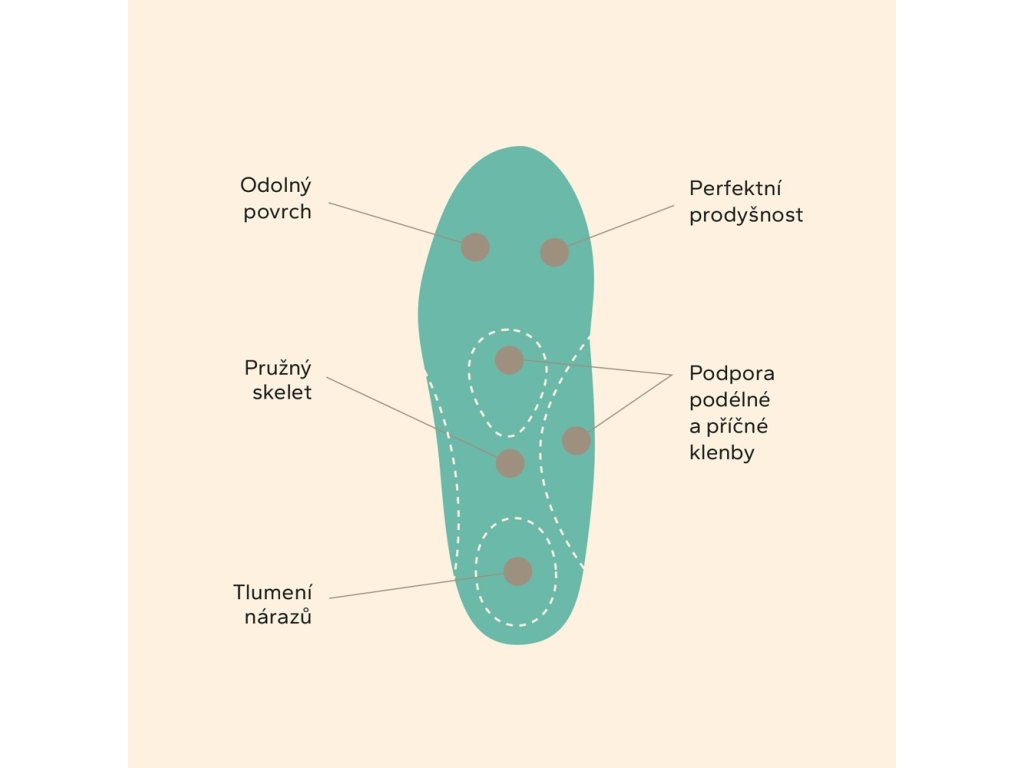 ● ortopedicky tvarované● podpora podélné a příčné klenby● pružný skelet pro přirozený pohyb chodidla● latexový polštářek v patě tlumí nárazy na patní kost● prodyšná pěnová vrstva s antibakteriální úpravou ● měkký došlap po celé ploše vložky● odolný a omyvatelný povrch● tvar lze mírně upravit zastřižením ve špičce